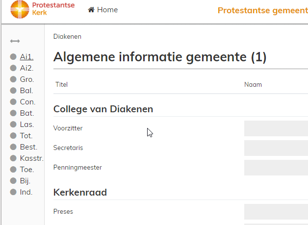 In dit gedeelte worden de bezettingen van de (algemene) kerkenraad en de (centrale) colleges van kerkrentmeesters en van diakenen opgegeven. Als een gemeente meer dan één wijkgemeente heeft, wordt het overzicht gevraagd van de centrale colleges: