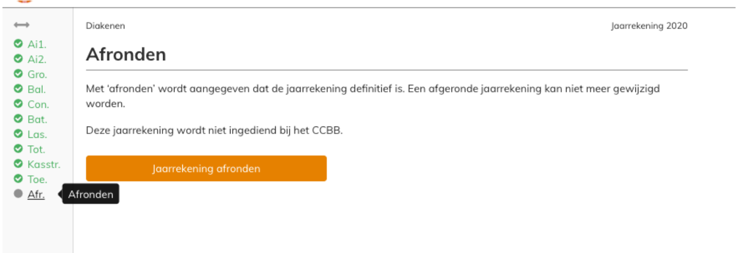 De jaarrekening wordt afgerond op het scherm ‘Afronden’. Net zoals bij jaarrekeningen voor gemeenten en diaconieën kan dat alleen, als alle voorgaande schermen ingevuld zijn.
